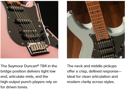 Each pickup is chosen for its role: the Seymour Duncan® JB humbucker delivers aggressive bite, while the Voiced Tone VTS-63 singles add balance, sparkle, and cut.