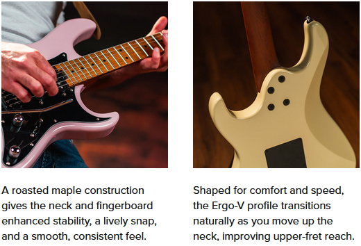 Roasted maple, a slim Ergo-V shape, and a compound radius give you a neck that feels faster, smoother, and more responsive up and down the fretboard.