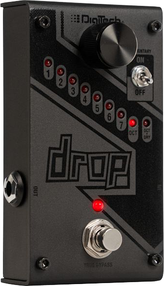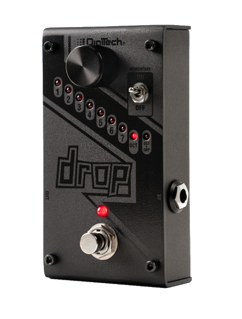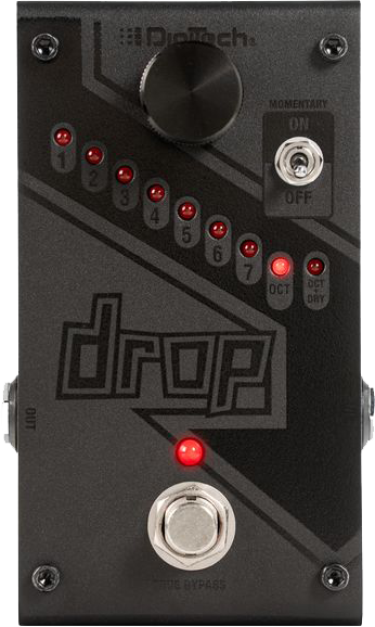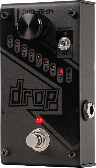 The DigiTech® Drop is a dedicated polyphonic drop tune pedal that allows you to drop your tuning from one semitone all the way down to a full octave. Get down-tuned chunk without having to change guitars! The Drop also features a momentary/latching switch. With the switch set to momentary, you can turn the Drop into a true performance pedal. Fast trills and roller-coaster pitch dips are at the tip of your toes.