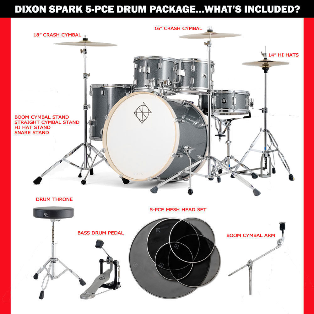 Dixon Spark Standard Series 5-Pce Drum Kit with Cymbals in Gun Metal