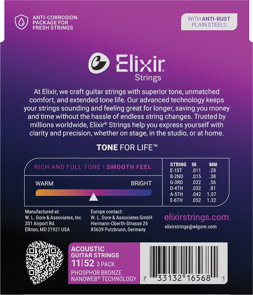 Elixir® Strings Acoustic Phosphor Bronze With NANOWEB Coating deliver distinctive phosphor bronze warmth and sparkle together With extended tone life.