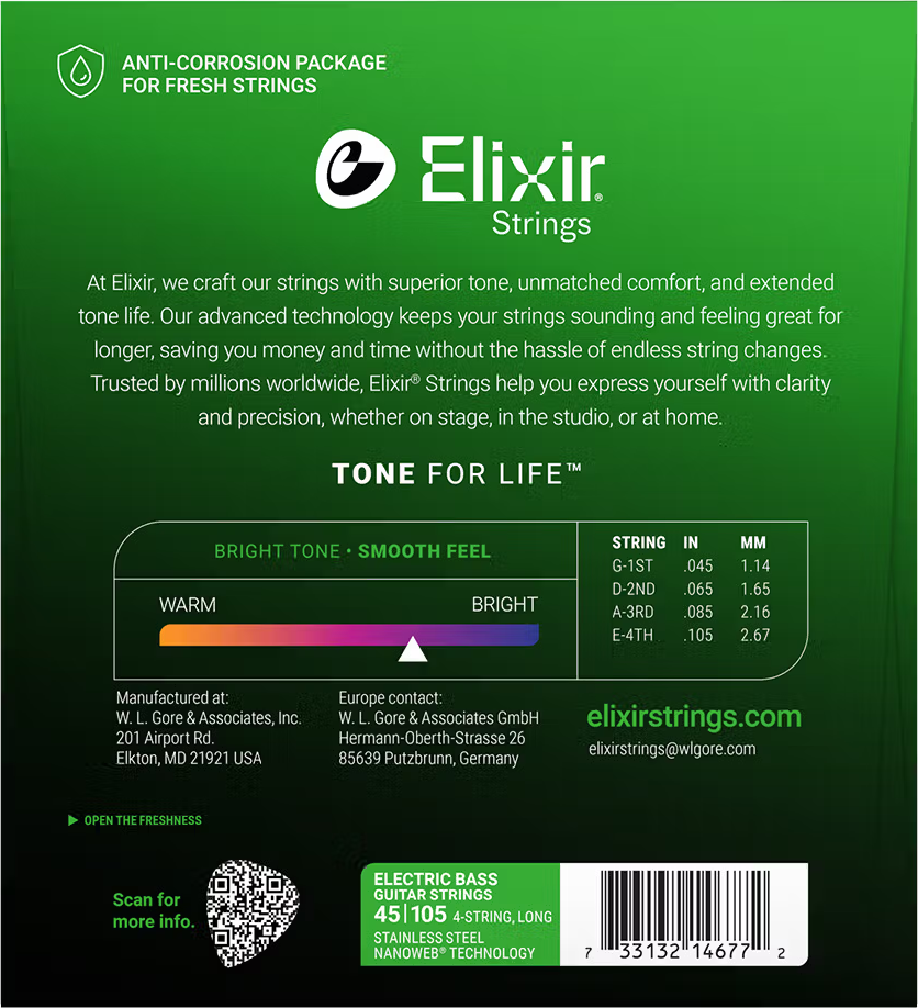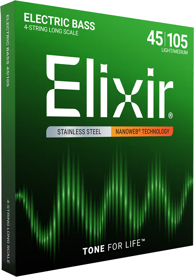 Elixir® Stainless Steel Bass Strings With a NANOWEB Coating provide a bRight stainless tone With deep lows.