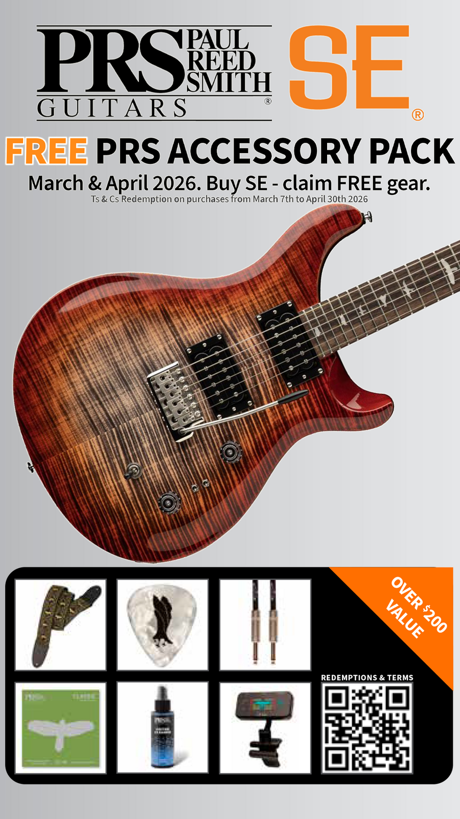 Buy any PRS SE Series Electric Guitar during March & April 2026 and receive over $200 worth of PRS accessories FREE! Simply submit your receipt through this link and your Accessory Pack will be sent straight to your door.