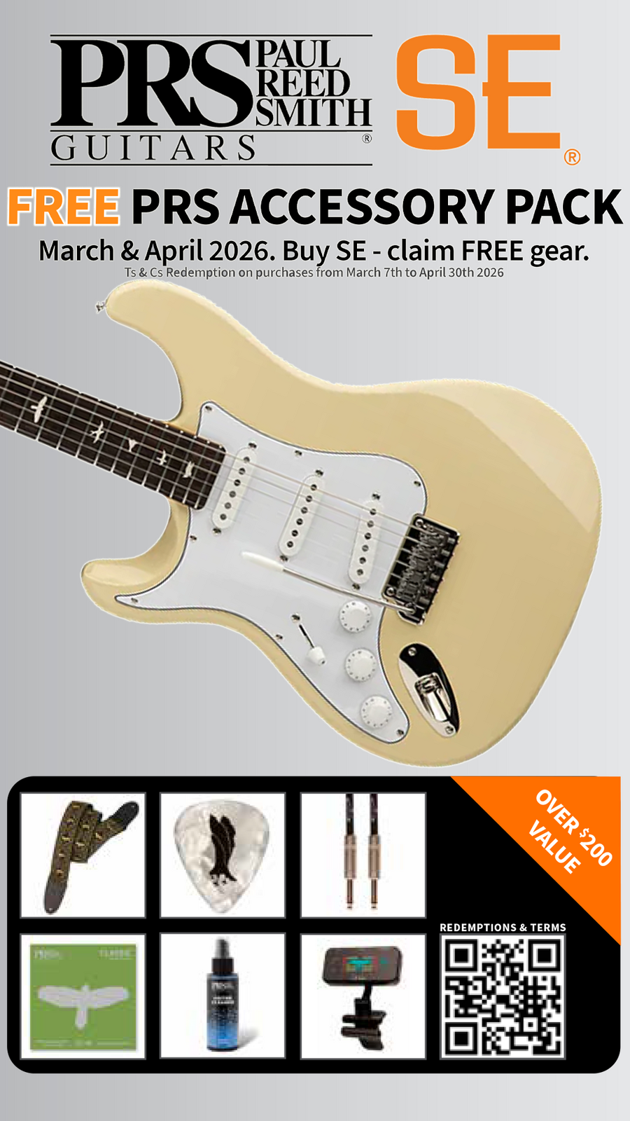 Buy any PRS SE Series Electric Guitar during March & April 2026 and receive over $200 worth of PRS accessories FREE! Simply submit your receipt through this link and your Accessory Pack will be sent straight to your door.