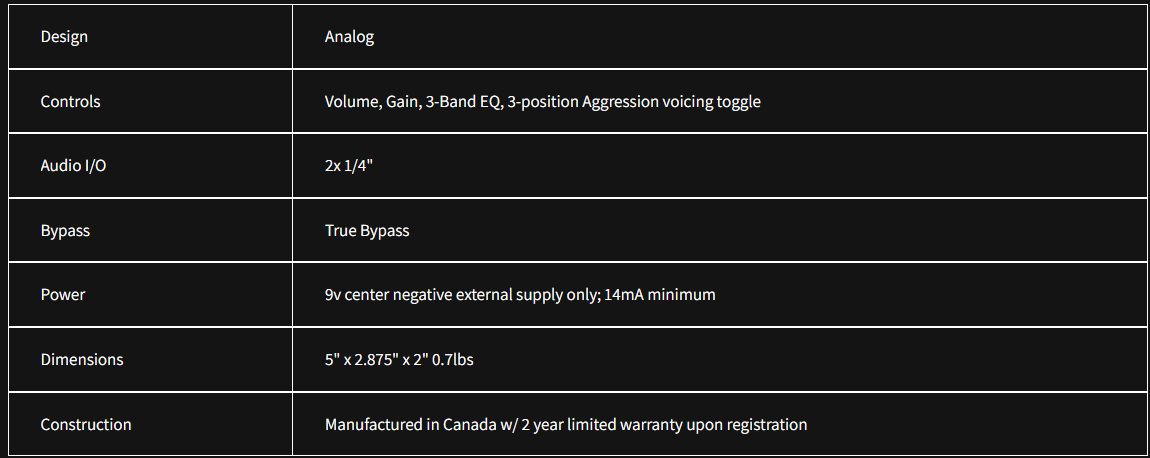 The G3 is a very tight & aggressive pedal. We recommend starting on Blue aggression even for a high gain tone. Take care to adjust the Treble knob to match your amp, & make sure to dial the gain back a bit if you plan on boosting into the G3 with an overdrive. It's a simple & toneful all-analog pedal that runs on traditional isolated 9 volt center negative power supplies.