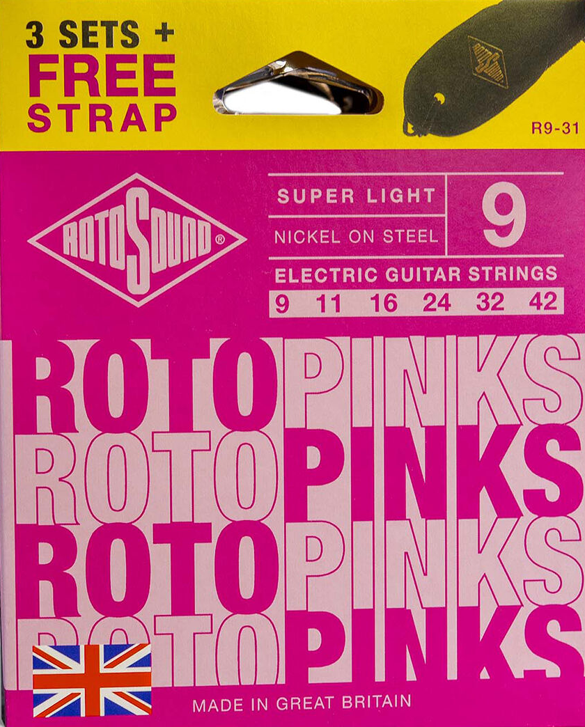 Rotosound Roto Pinks Electric Value 3-Pack String Set + Bonus Strap