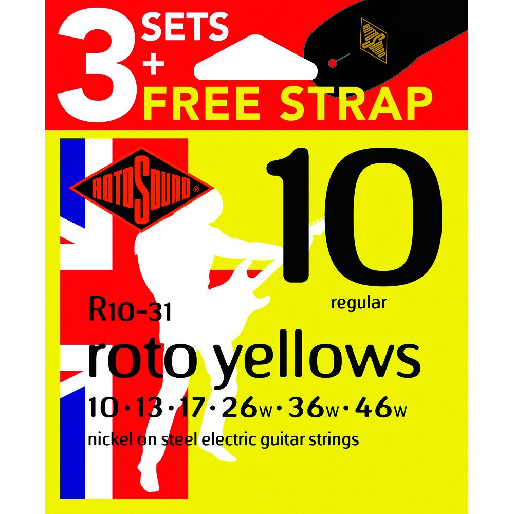 Rotosound Roto Yellows Electric Value 3-Pack String Set + Bonus Strap