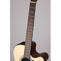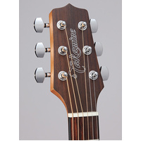 The Taka-mini GX18CE-NS is a 3/4 size guitar with a full size voice. Featuring custom designed bracing, a solid spruce top in a scaled down version of the famous Takamine NEX body style, this very worthy instrument will win your playing time. Mahogany back and sides, laurel fingerboard and TP4T preamp with tuner round out this very cool guitar.