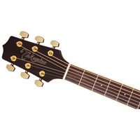 With deluxe appointments, solid-top construction and great performance features, including a Venetian-style cutaway and Takamine electronics system, the left-handed GD51CE-LH is built to bring your music center stage. Ready for the demands of any performance situation, the GD51CE-LH features a solid spruce top and black walnut back and sides that produce a big, bold sound. The slim mahogany neck and 12”-radius bound laurel fingerboard provide great feel and playability, while the onboard Takamine TP-4TD preamp system gives you a built-in tuner with three band EQ and gain controls for rock-solid amplified performance and versatility. Other great features include a synthetic bone nut and split bridge saddle, black walnut headcap, abalone rosette and dot inlays, gold die-cast tuners and a beautiful gloss finish. Available in Natural.