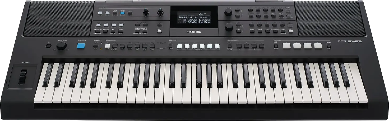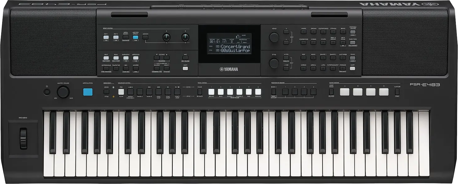 The Yamaha PSR-E483 is a powerful and flexible 61-key portable keyboard built for beginners, home players, content creators, and live performers. It features 860 high-quality Voices covering pianos, organs, strings, guitars, synths, and world instruments, along with 345 automatic accompaniment Styles that let you perform with a full virtual band. Super Articulation Lite adds realistic playing details such as guitar string noise and wind instrument breath sounds, while dual, split, and layer modes allow you to combine sounds for rich, creative performances.